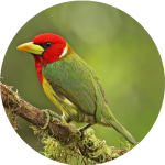 Barbets are brightly colored birds found in tropical regions worldwide. They are known for their stout bodies, large heads, and heavy bills, often adorned with bristles or serrations. Barbets are primarily frugivorous, feeding on fruits and berries, but they also consume insects and nectar. They nest in cavities excavated in trees or banks.